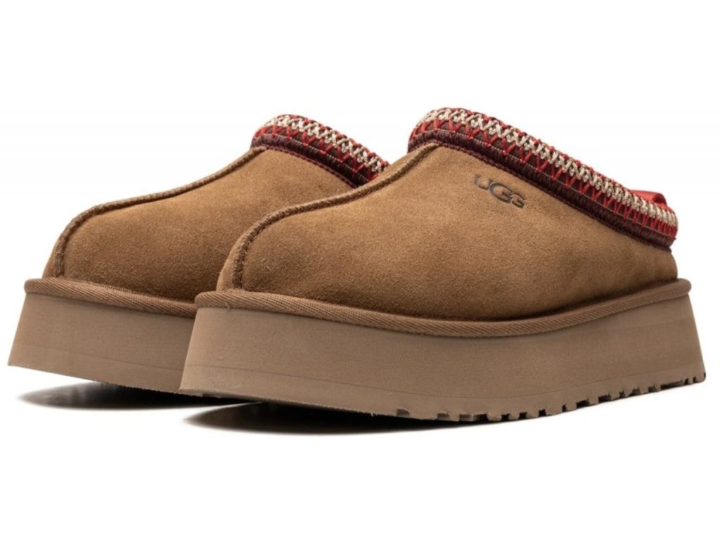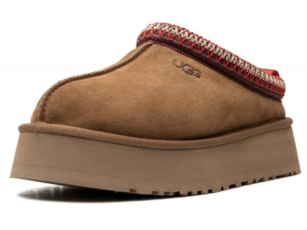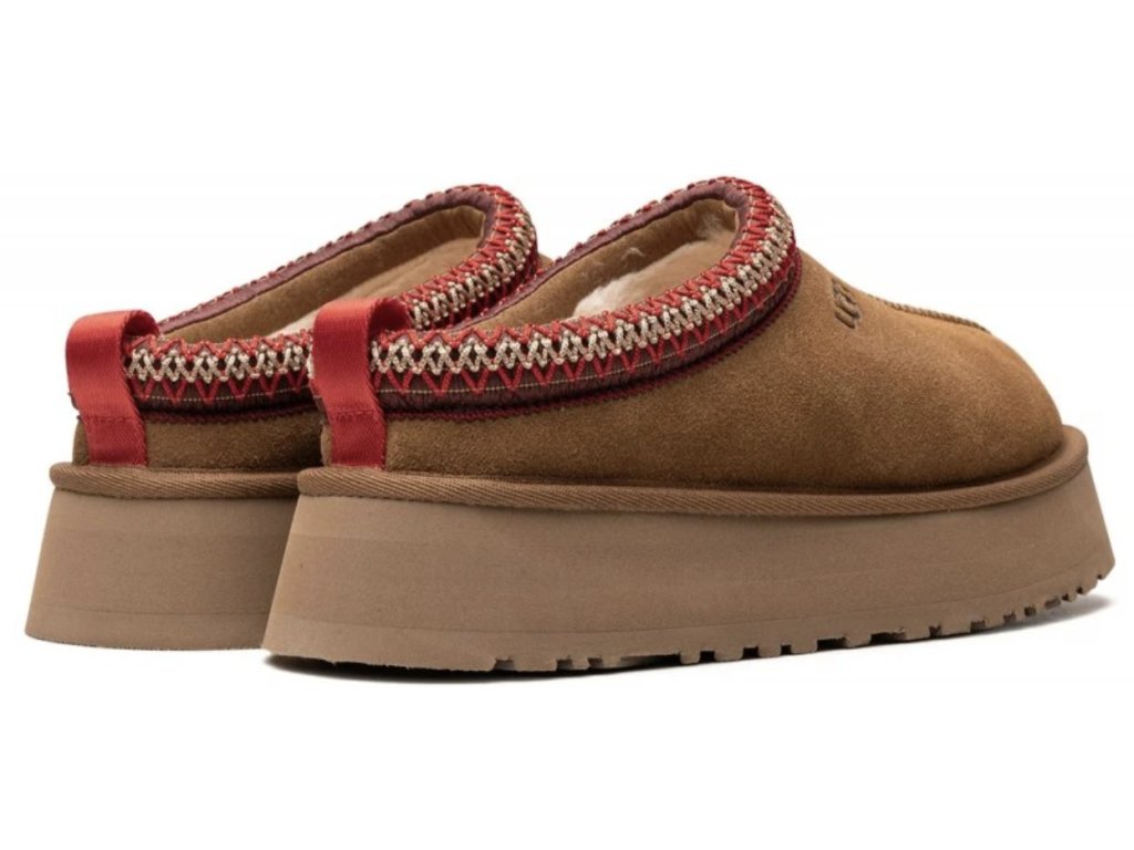 Dámské UGG Tazz Slipper v ikonickém odstínu „Chestnut“ spojují nadčasový design s legendárním pohodlím značky UGG. Prémiový semišový svršek v teplé hnědé barvě doplňuje ručně prošívaný pletený lem a zvýšená platformová podešev, která dodává pantoflím moderní, streetwearový charakter.