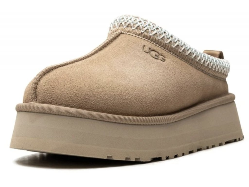 Dámské UGG Tazz Slipper v ikonickém odstínu „Sand“ spojují moderní vzhled s legendárním pohodlím značky UGG. Stylový semišový svršek v přírodním tónu doplňuje ozdobný pletený lem a zvýšená platformová podrážka, která dodává pantoflím aktuální streetwearový nádech.